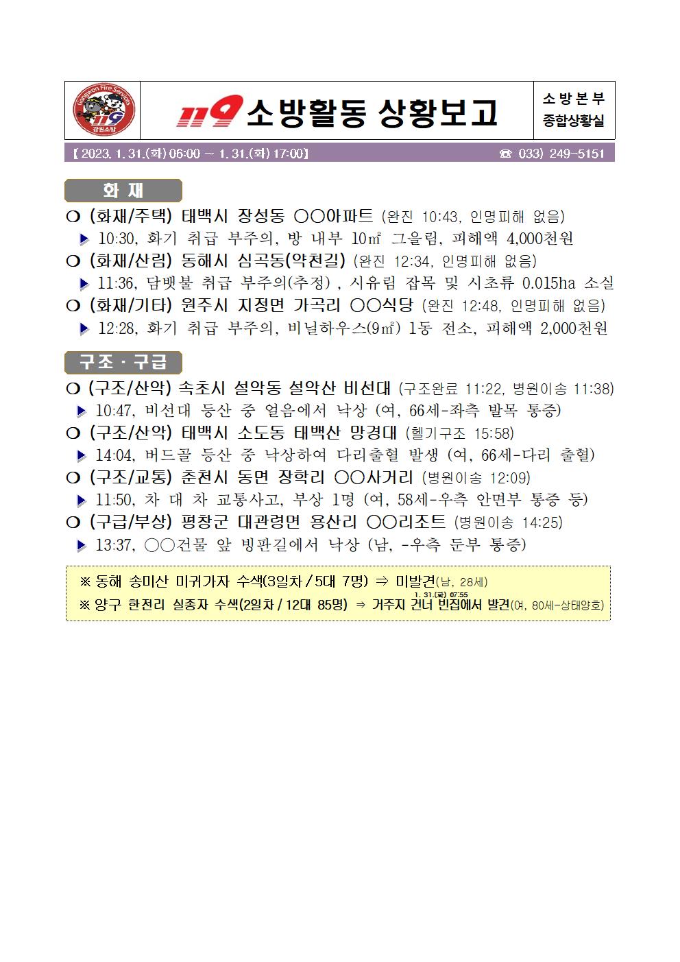 119 소방활동 상황보고(1. 31. 화) 17:00