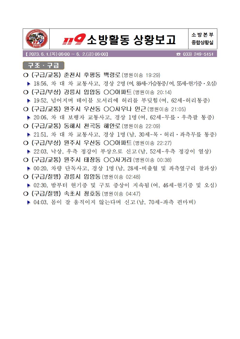 119 소방활동 일일상황보고(6. 2.금) 06:00