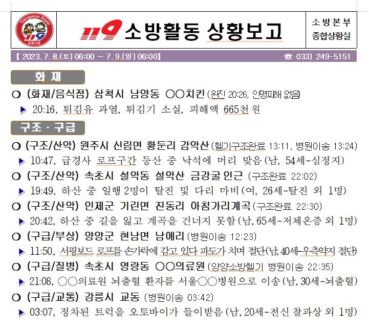 119 소방활동 일일상황보고(7. 9. 일) 06:00