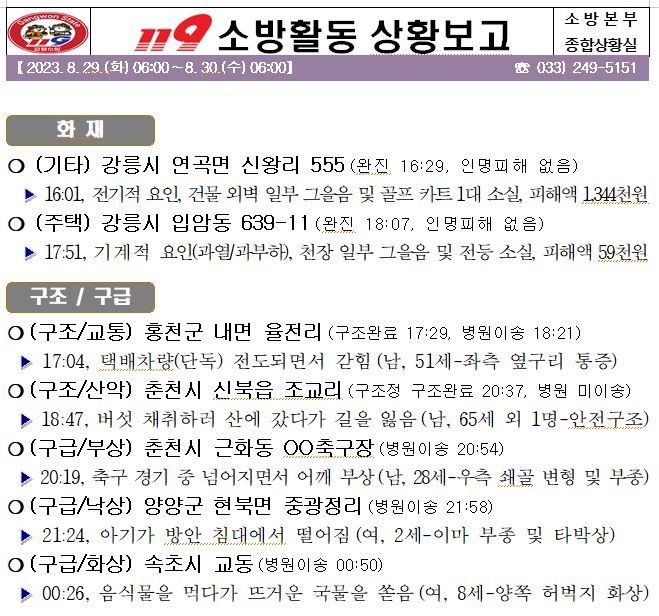 119 소방활동 일일상황보고(8.30.수) 06:00