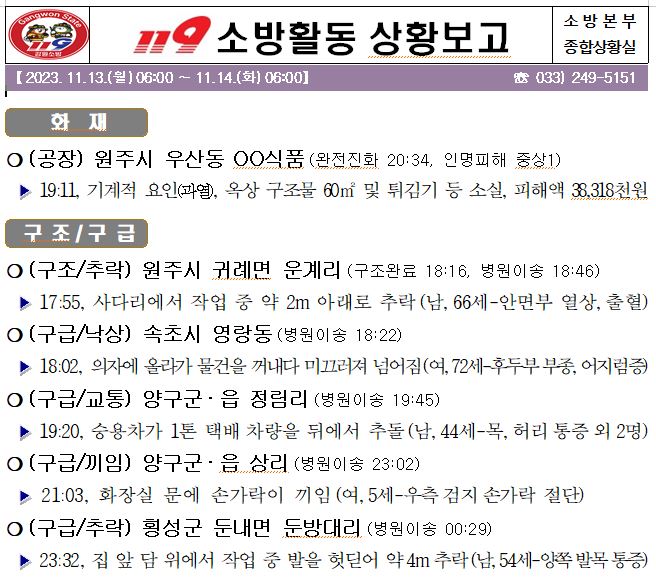 119 소방활동 일일상황보고(11.14.화) 06:00