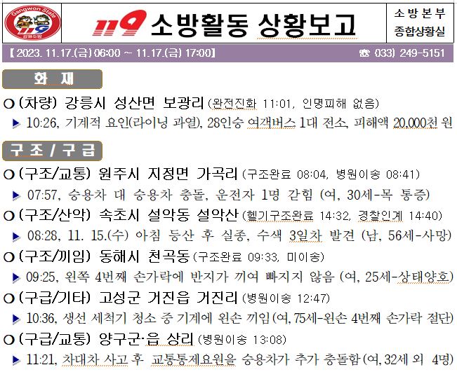 119 소방활동 일일상황보고(11.17.금) 17:00