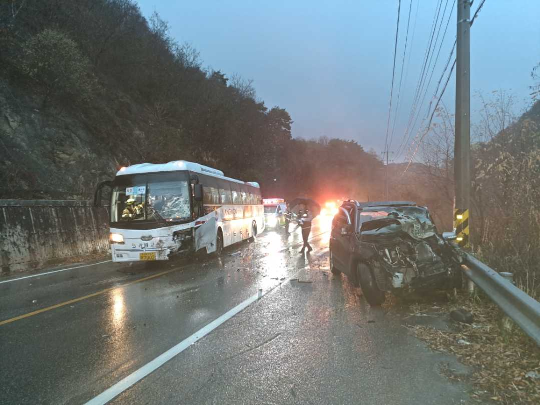 화천 하남면 5번 국도상 차대 버스 충돌사고 현장 사진 2점)