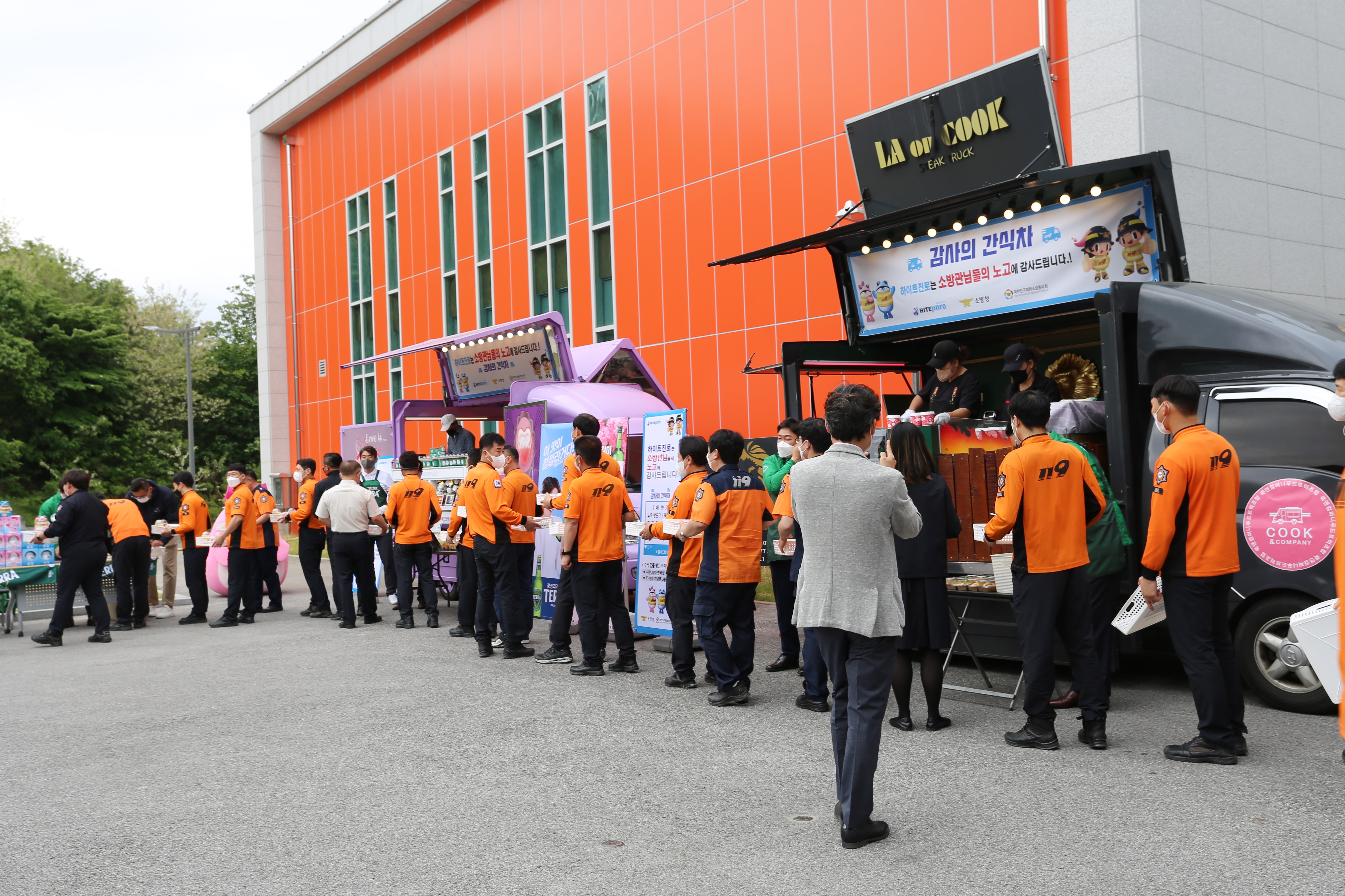 강릉소방서(서장 김동기)는 지난 13일 오전 10시 강릉소방서 차고 앞에서 대한민국 재향소방동우회와 하이트진로가 후원하는 감사의 간식차 행사를 실시했다고 밝혔다.