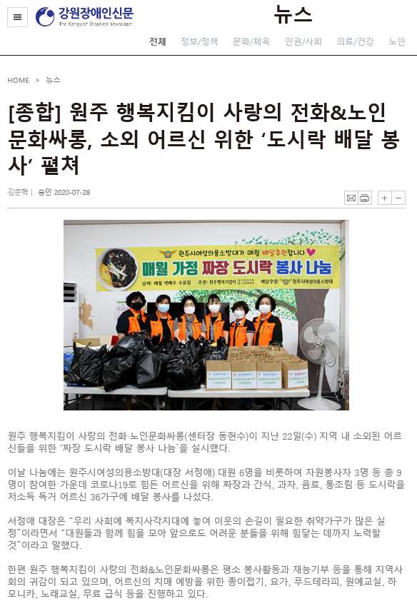 | 25177 | 원주여성의용소방대 소외 어르신 위한 '도시락 배달 봉사' 펼쳐 | 원주홍보 | 2020-08-06 | 1324 | |