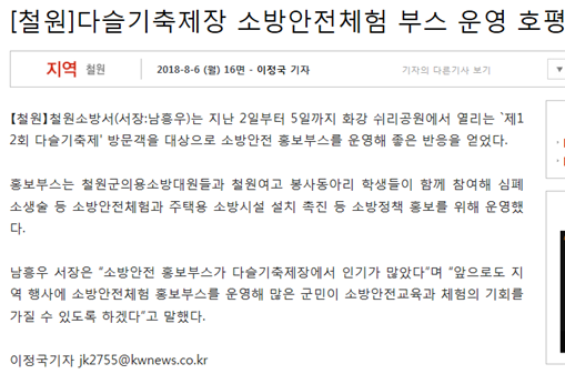 | 23180 | (철원) 다슬기 축제 소방안전체험 홍보 부스 운영 | 철원홍보 | 2018-08-07 | 224 | |