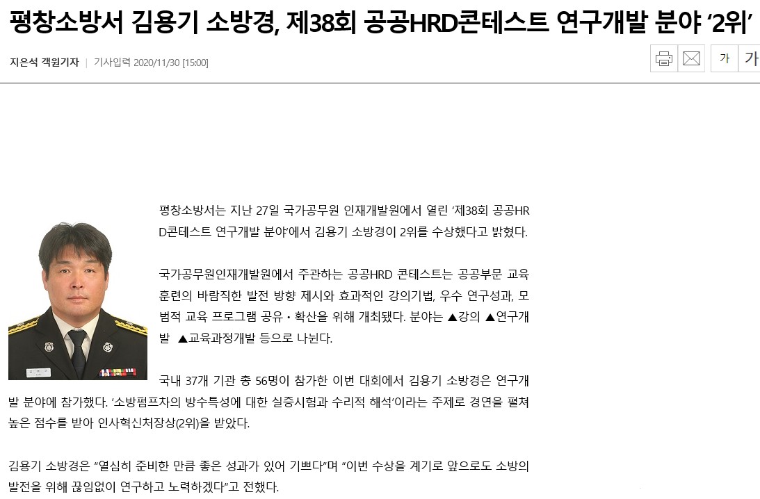 | 25610 | 평창소방서 김용기 소방경, 제38회 공공HRD콘테스트 연구개발 분야 ‘2위’ | 평창홍보 | 2020-11-30 | 1021 | |