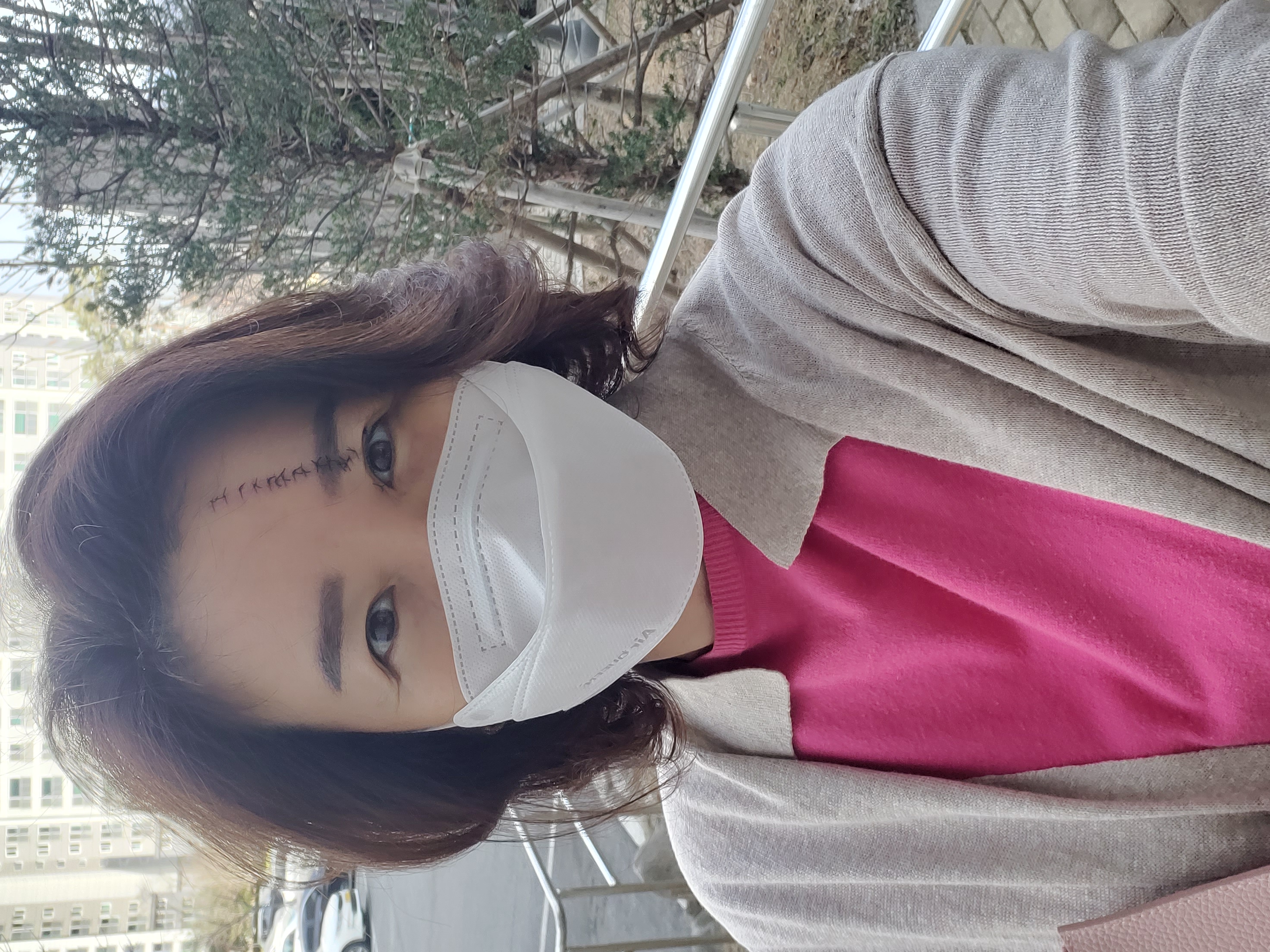 이마 18바늘을 꿰매었다.