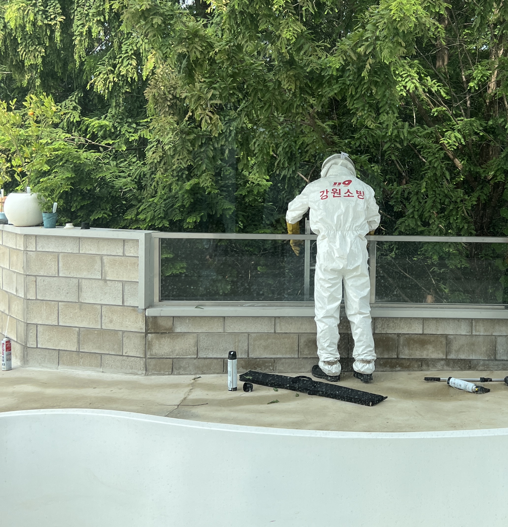 삼복더위에 방호복 입고 사다리 타고 벌집제거를 웃으면서 해주는 사람