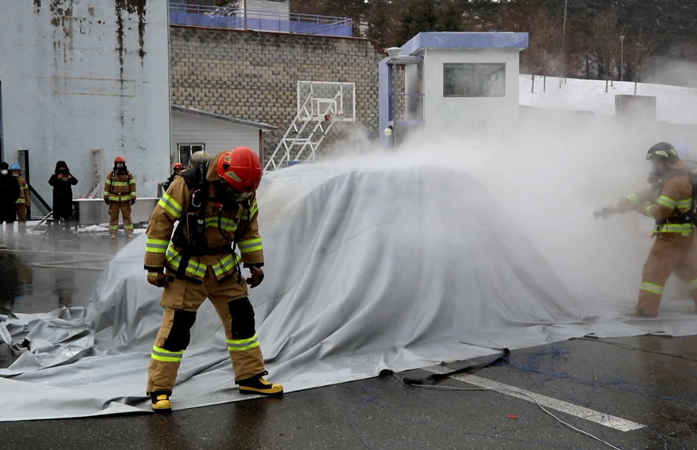 ○ 용석진 예방안전과장은“지하층에서 전기차화재가 발생하면 진화에 어려움이 많다.”면서“화재의 신속한 진화와 피해의 최소화를 위해 대응에 유용한 질식소화포를 비치해 달라.”고 말했다.