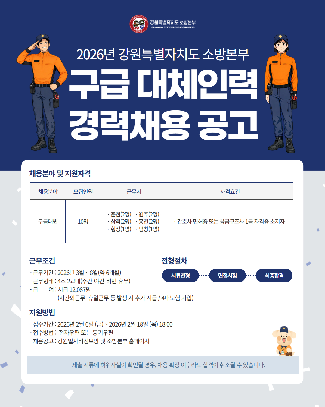 ○ 이번 채용에는 총 10명을 선발하며, 근무 기간은 3월부터 8월까지 6개월간이다. 최종 합격한 인원은 소방서에서 구급현장 활동 보조 등의 업무를 수행하게 된다.