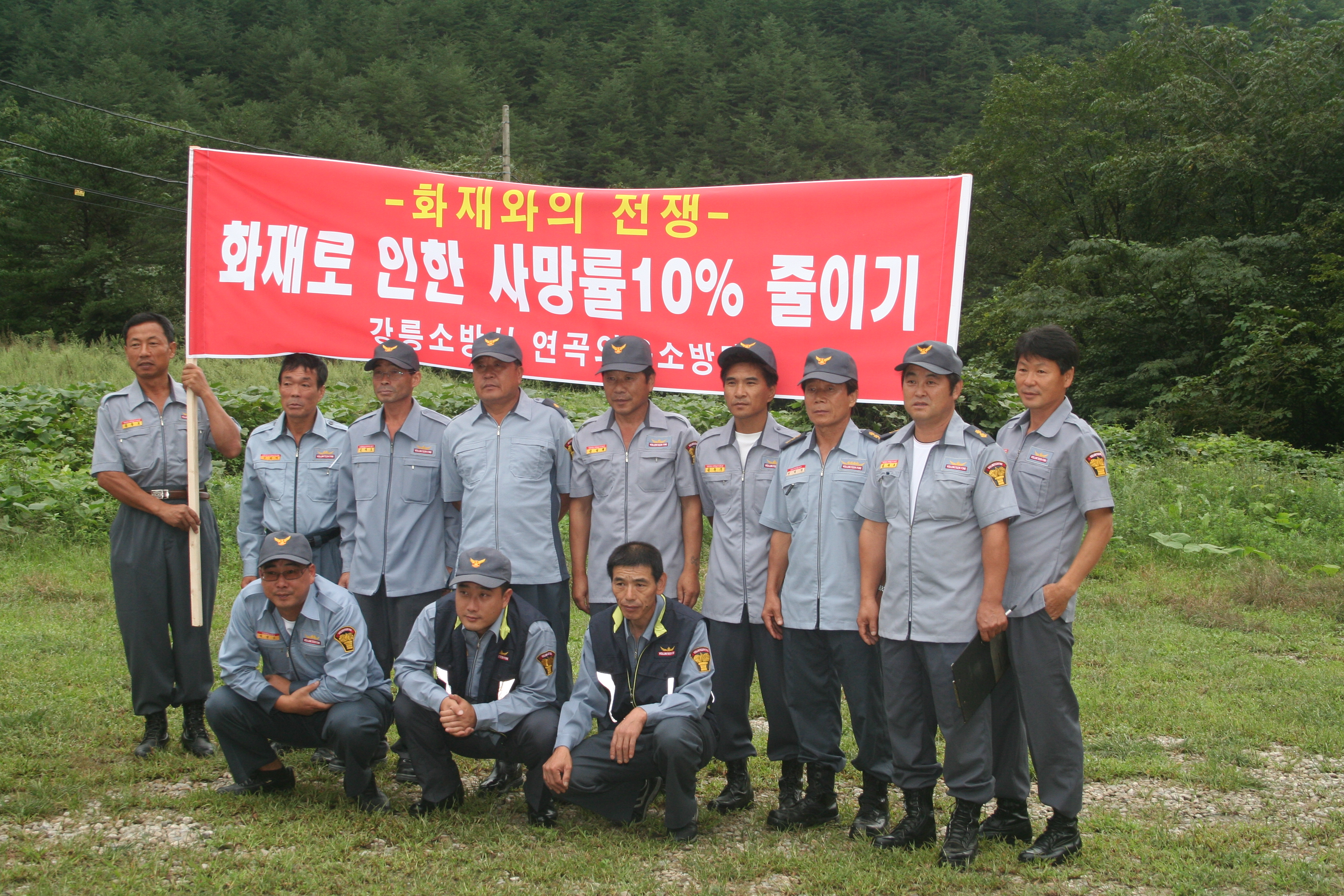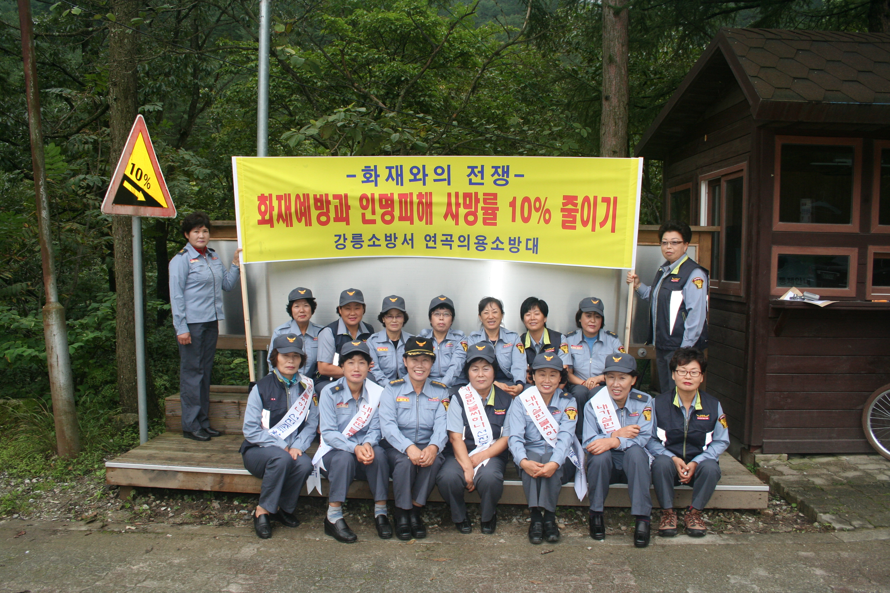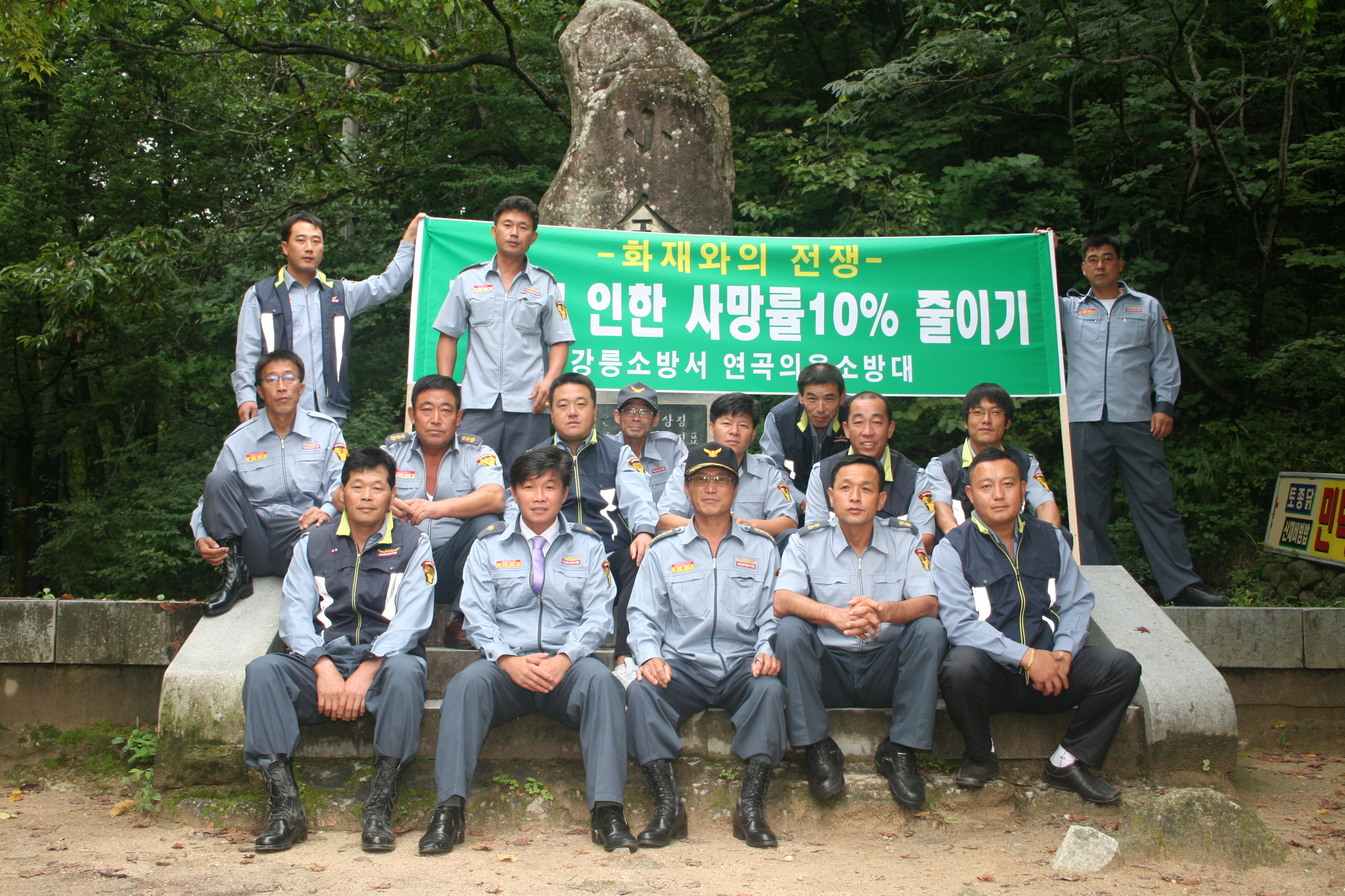 연곡 의용 소방대 남,여 대원들이 소금강에 모여서