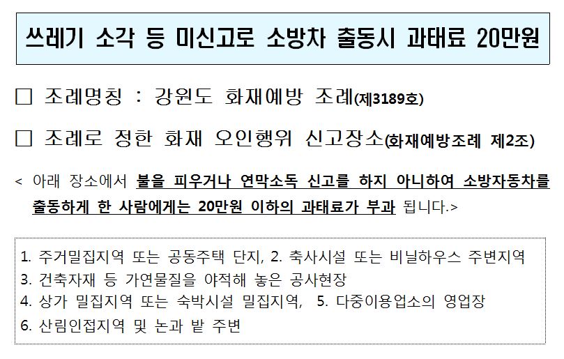 쓰레기 소각 등 미신고로 소방차 출동시 과태료 20만원이 부과됩니다
