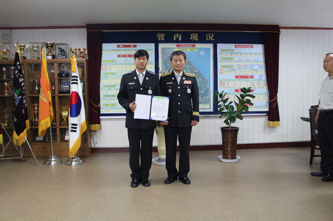 강릉소방서(서장 정은철)는 24일 서장실에서 심정지로 죽음의 문턱에 놓인 환자를 극적으로 소생시킨 황일기 소방장에게 '하트세이버(Heart Saver) 인증서 및 배지' 수여식을 하였다