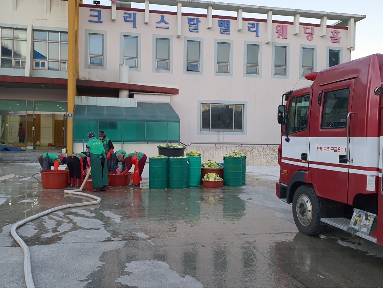 11월 22일 7:00~ 9:18 분 경 옥계119안전센터에서는 옥계종합복지회관 옥계번영회가 주최하는 사랑, 나눔, 배려 연말이웃돕기 사랑의 김장김치 담그기 행사에 급수지원을 실시했습니다.