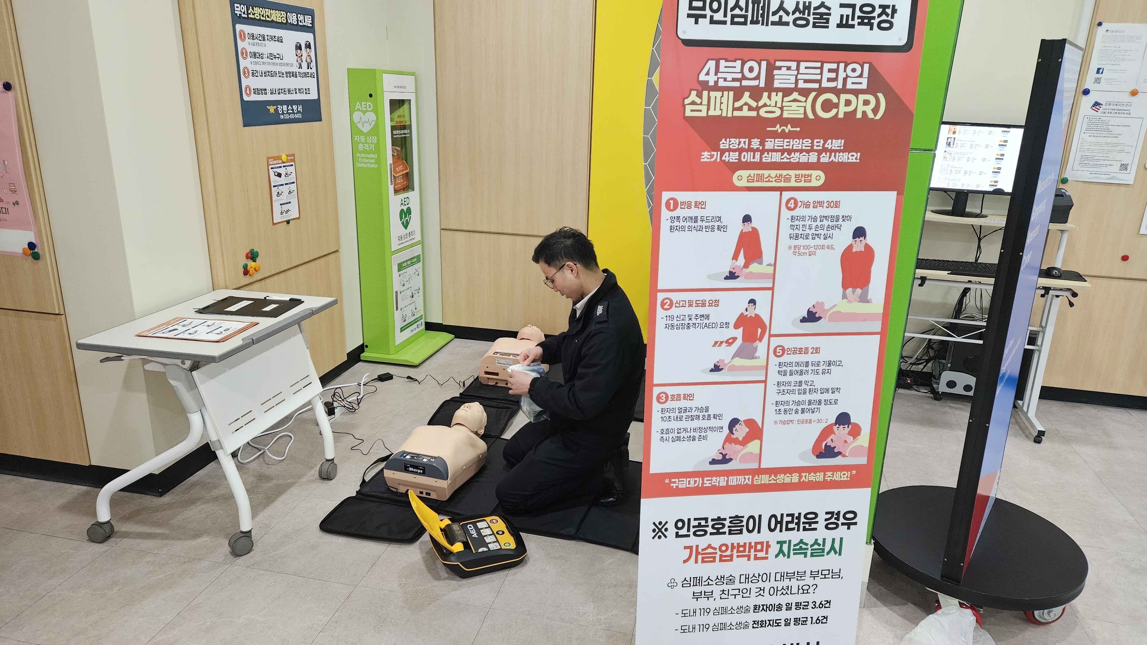 금일 강릉소방서에서 강릉모루도서관 1층에 무인심폐소생술 교육장을 설치하였습니다.