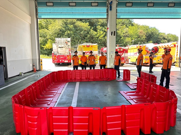 이에 소방서는 실제 화재를 가정한 차체를 둘러쌓아 물을 채워 냉각하는 이동식 수조를 사용한 진압훈련을 실시했습니다.