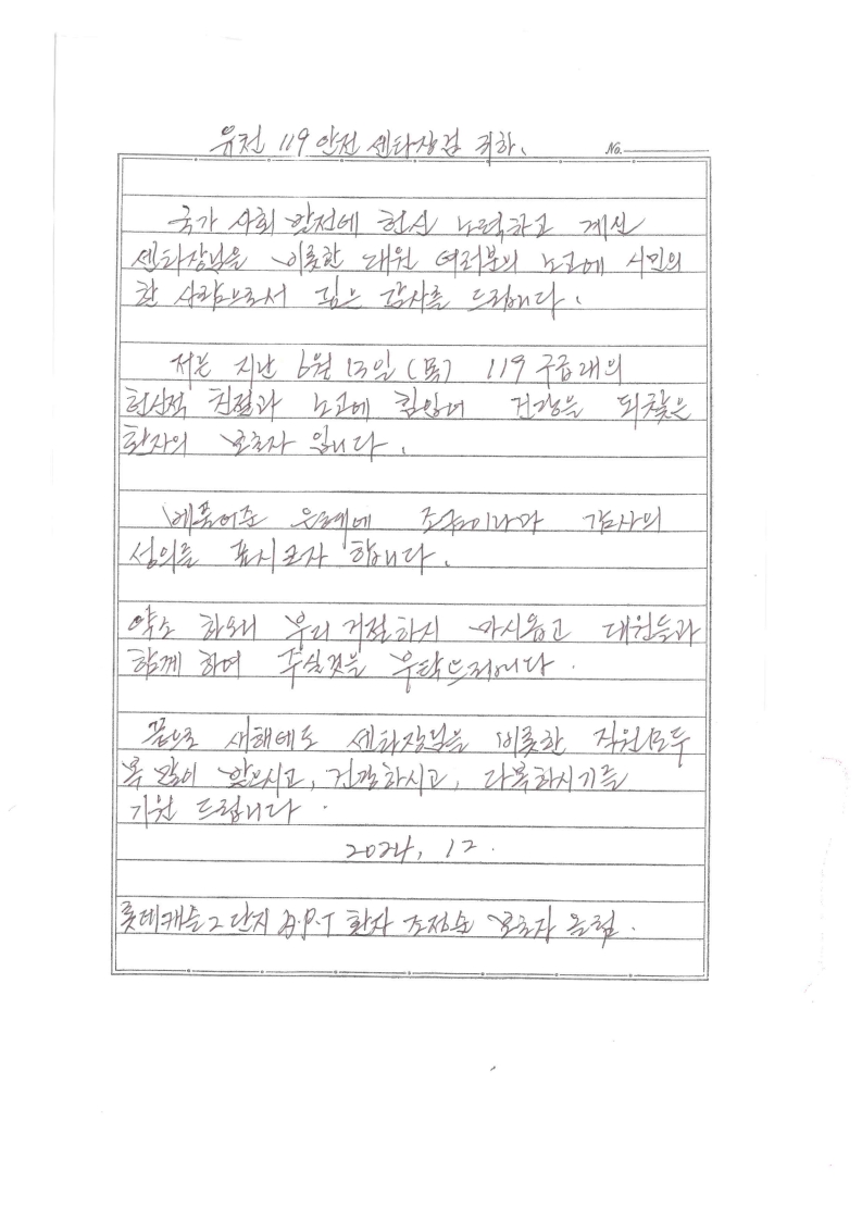 지난 6월 13일 옥천119안전센터 구급대 이송 수혜자 조**의 보호자님께서 보내 주신 손편지와 간식을 받고, 우리 대원들은 모두 감동과 보람을 느끼며 즐거운 하루를 맞이했습니다.