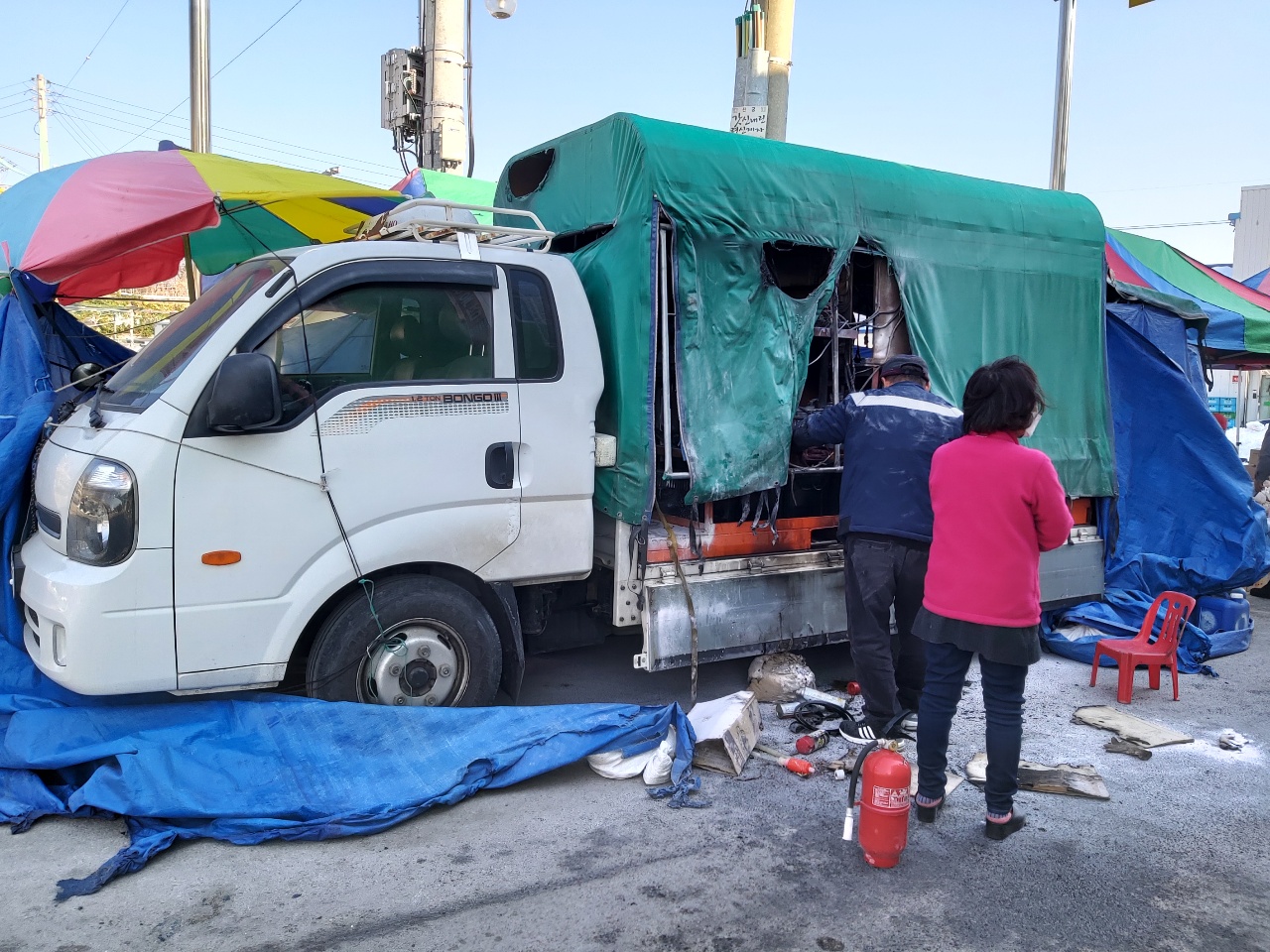 이번 화재는 1t 트럭 적재함에 뻥튀기 기계와 전기장치(대형 배터리) 부위의 배선 문제로 발생했다. 불을 발견한 주변 점포 상인은 소화기를 이용해 초기 진화했다.