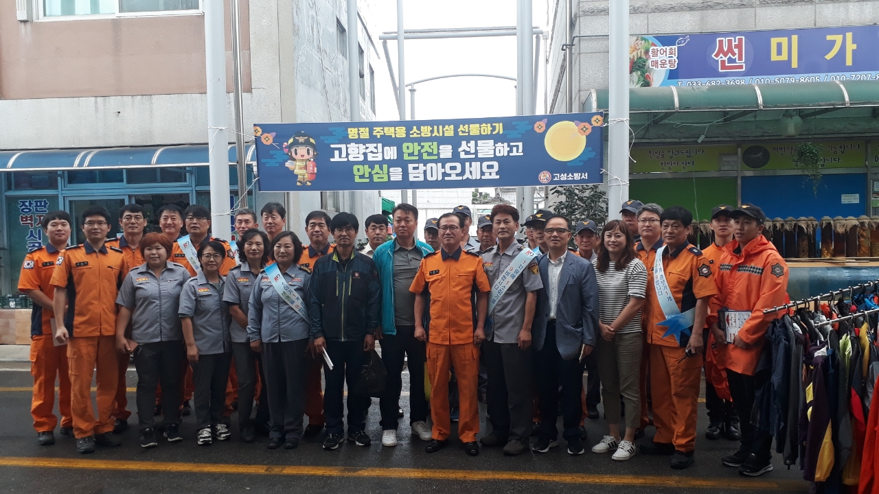 고성소방서(서장 유중근)는 11일 추석 연휴를 맞아 주택용 소방시설 보급 확산과 안전문화의 정착을 위해 ‘고향 집, 주택용 소방시설 선물하기 홍보’ 캠페인을 천년고성시장, 거진전통시장, 토성하나로마트에서 소방공무원·고성군의원·의용소방대원·시장관계자 등 100여명 참가한 가운데 실시했다고 전했다.