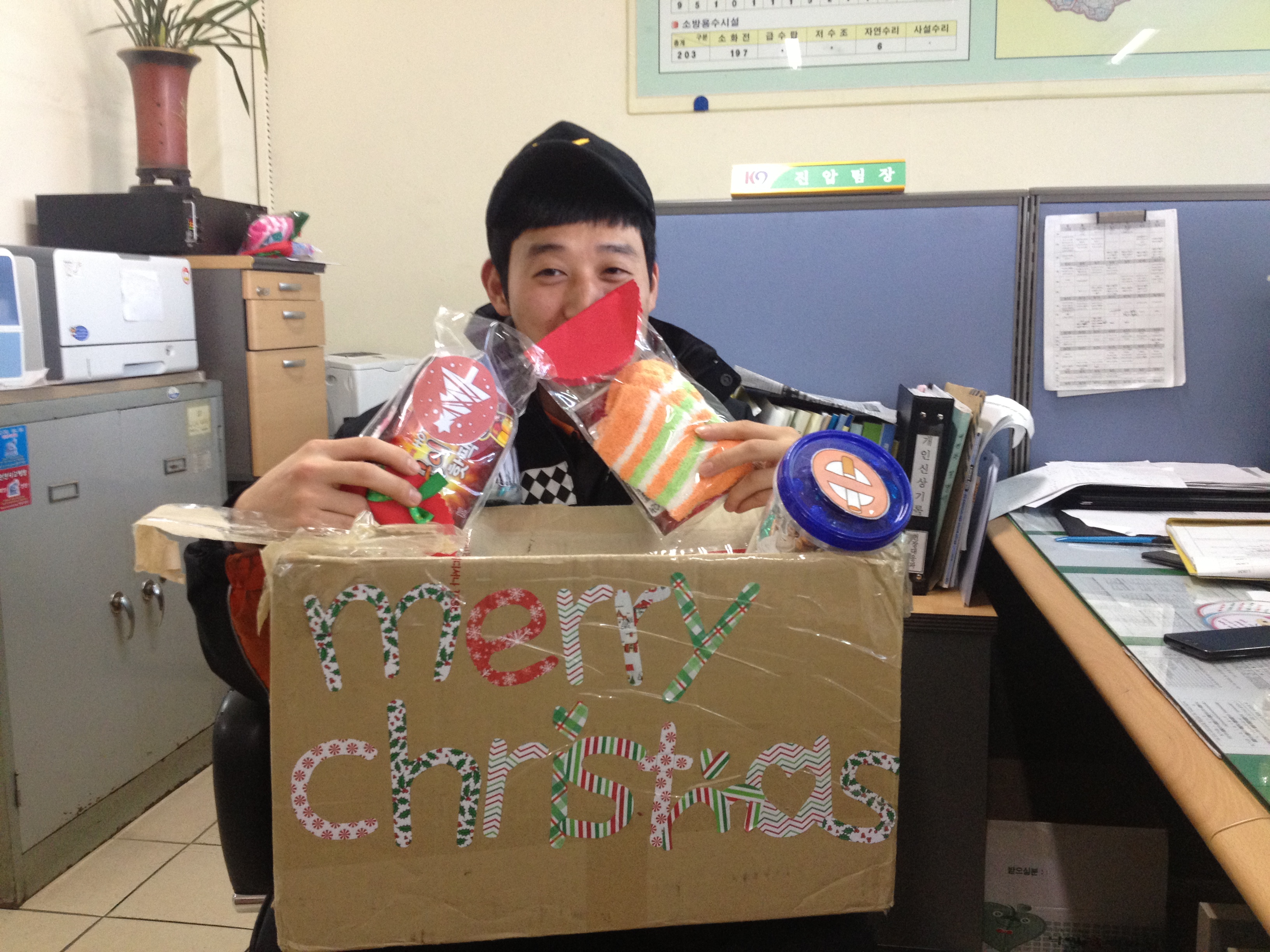 홍천소방서 (서장 이종진)에서는 25일 크리스마스를 맞아 산타클로스가 선물을 가득 보내주셨습니다. 현장대응과 소방사 홍순학 직원의 여자친구분께서 추운 날씨에 고생하는 원들의 노고에 감사하며 안전근무를 당부하셨습니다. 앞으로 홍순학 직원의 앞길에 좋은일만 가득하길 직원모두가 바랍니다.메리 크리스마스 ~~^^
