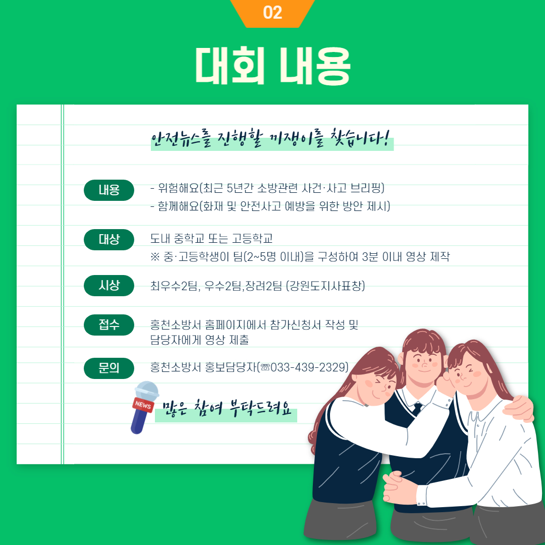 | 971 | 제15회 강원도 청소년 119안전뉴스 영상 경연대회(~8.22까지) | 홍천홍보 | 2022-08-04 | 633 | |