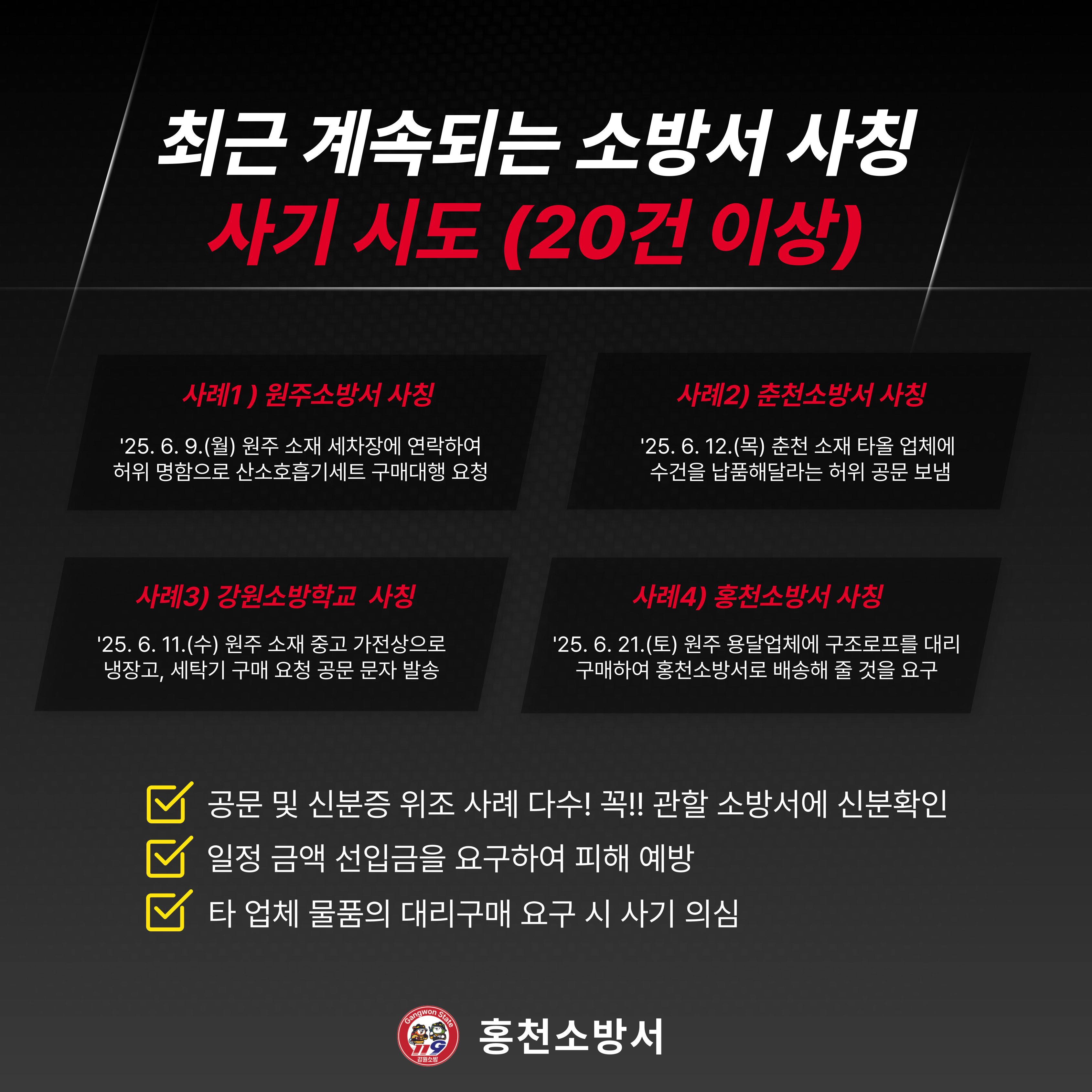 최근 소방서를 사칭해 물품 대리구매를 요청하는 등 위조된 공문서와 명함을 이용해 접근하는 사기 시도가 계속 발생하고 있습니다.
