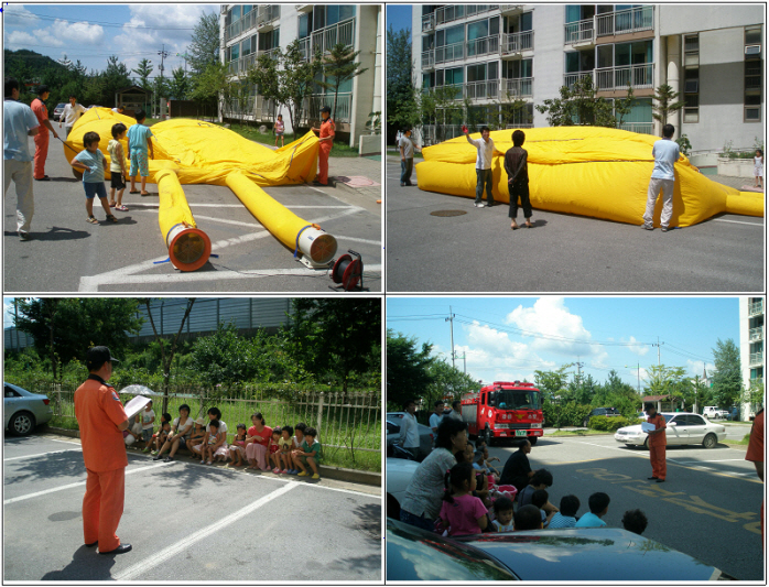 이번 훈련은 고가사다리차 진입 불가한 상태를 가정하여 아파트 관계자에 의하여 자체보유한 공기안전매트를 활용하여 전개 및 숙달훈련을 실시하였습니다.