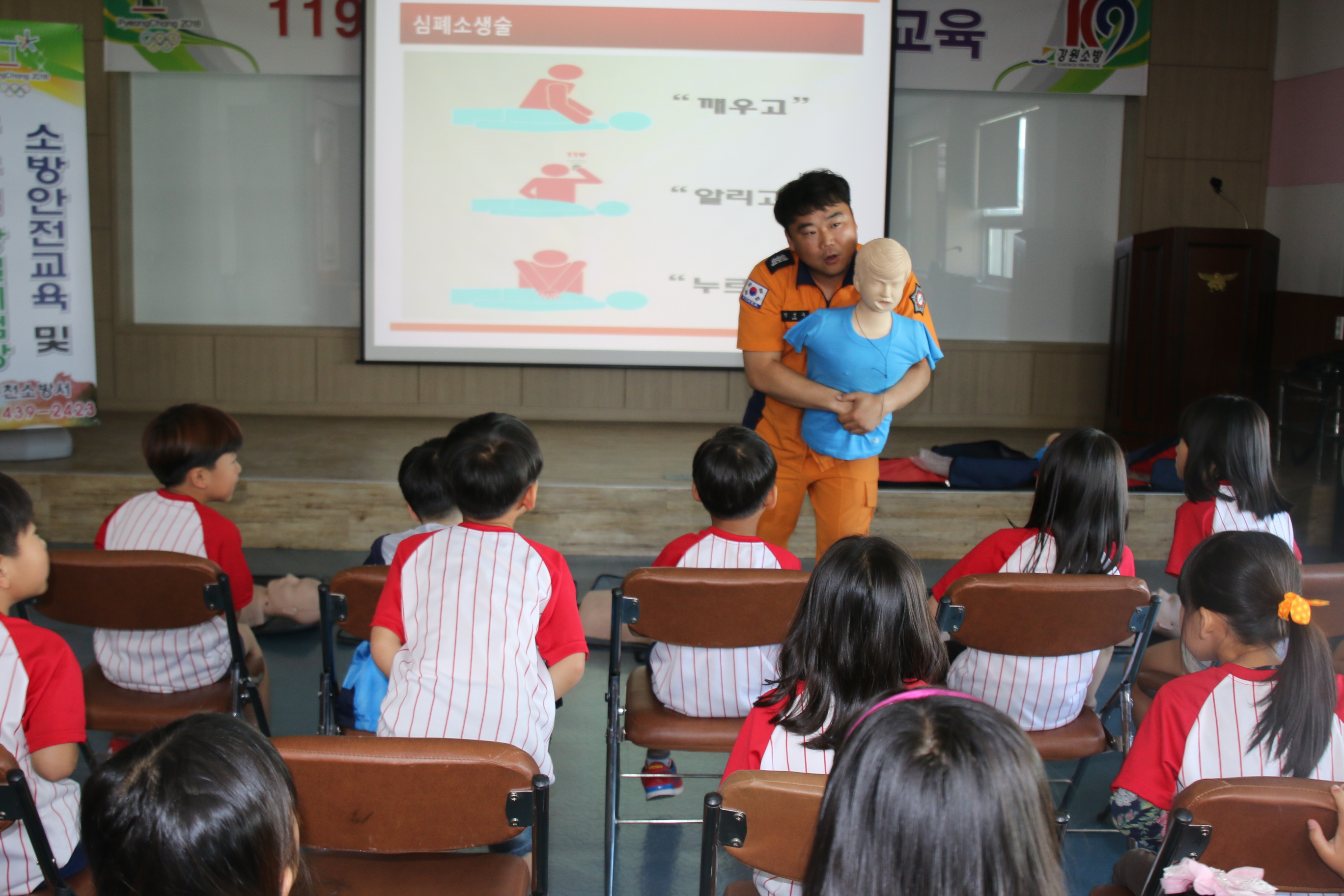 안성우 소방안전교육담당은 미래 소방관을 꿈꾸는 초등학교 저학년 어린이들이 이해하기 쉽도록 ‘소방관이 하는일’을 소개하고, 기도폐쇄시 대처법과 CPR요령을 교육하였다.