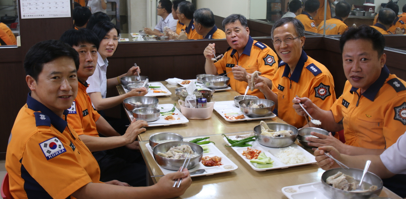 □ 이종진 홍천소방서장은 15일(금) 구내식당에서 초복을 맞아 30도를 오르내리는 찜통더위로 체력이 급격히 소진된 직원들의 체력보강을 위해 인삼, 대추 등 각종 양념을 넣어 정성스레 준비한 삼계탕을 전 직원과 함께 나눠 먹는 삼계탕 데이 행사를 가졌다.