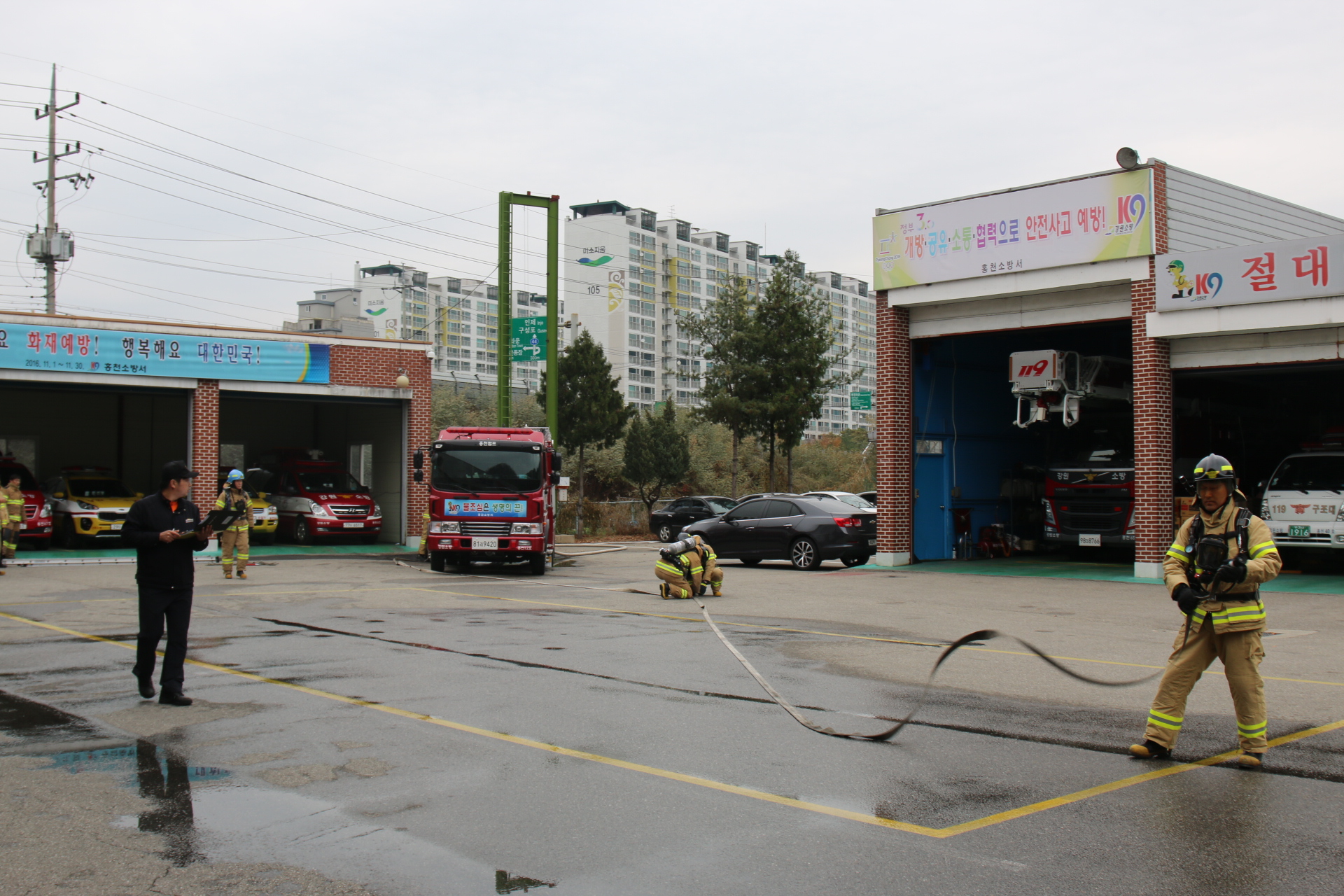 홍천소방서(서장 이종진)는 이번주 7일(월)부터 11일(금)까지 일주일간 본서 1층 차고에서 119안전센터 및 구조대 등 현장 활동 소방공무원 110여명을 대상으로 직무능력 향상과 현장대응활동 능력을 강화하기 위해 소방전술훈련 평가를 실시한다.