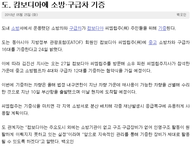 0 강원도민일보 5면 및 강원일보 -"도, 캄보디아에 소방구급차 기증