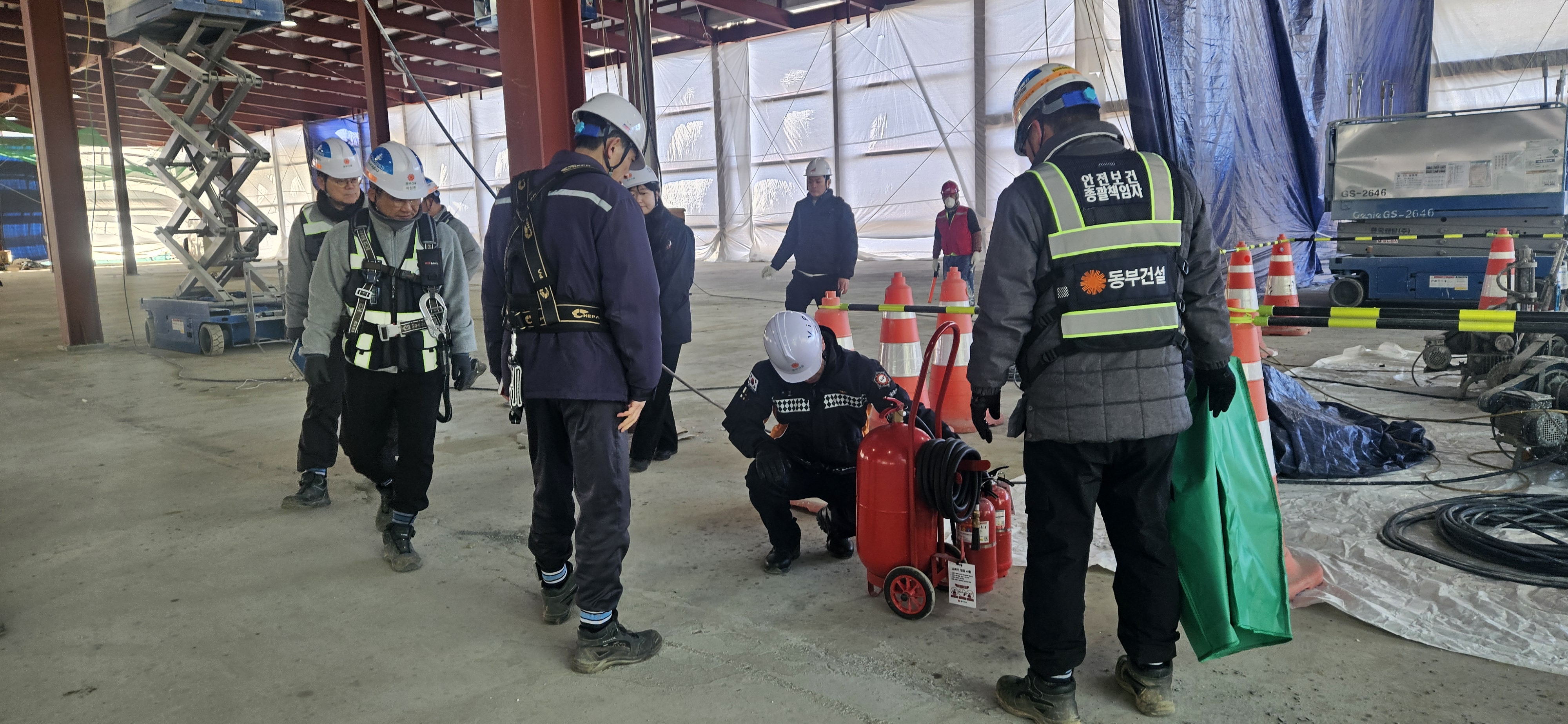 현장에는 허병열 대응총괄과장을 비롯한 소방서 관계자 5명과 군청 관계자 1명이 참석해 합동으로 임시소방시설 설치·관리 실태를 점검하고, 용접·용단 작업 시 화재예방수칙 등 주요 위험요인에 대한 안전교육을 실시했다.