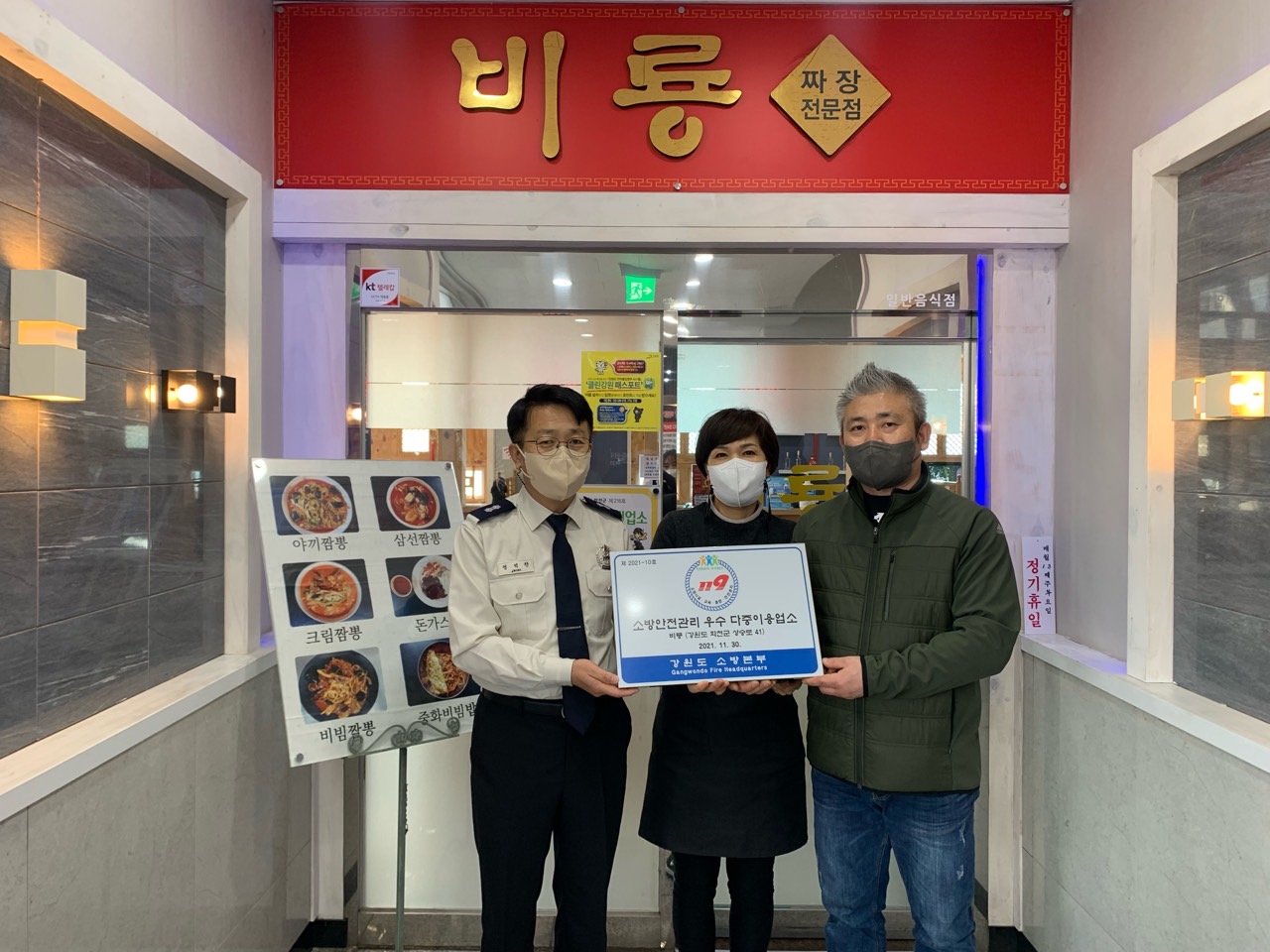□ 화천소방서(서장 허강영)는 12월 1일(수) 오후 3시 음식점 비룡을 방문하여 소방안전관리 우수 다중이용업소 인증표지 부착 행사를 가졌다고 밝혔다.