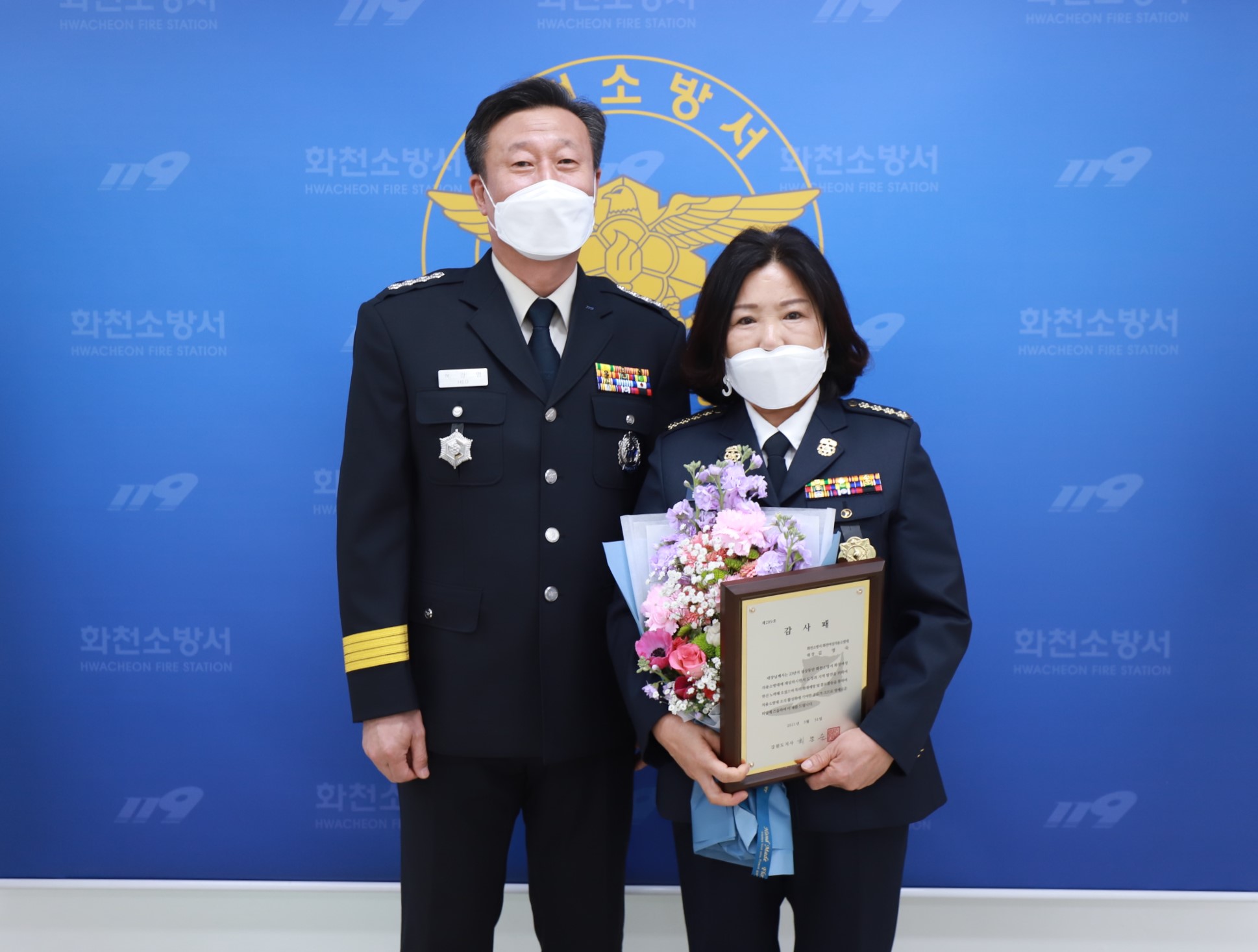 김영숙 이임 화천여성의용소방대장에게 그간의 노고를 치하하고자 감사패를 전달했습니다.