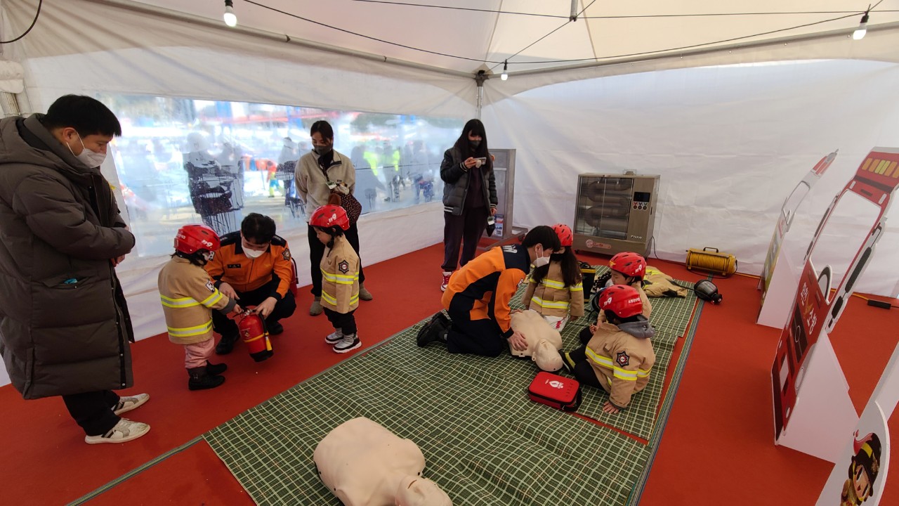 '2023 얼음나라 화천산천어축제' 소소심 소방안전체험장 소방홍보부스에서 관광객들에게 소화기 사용법, 심폐소생술 교육 등(주택용소방시설 설치하기 홍보)을 운영하고 있습니다.