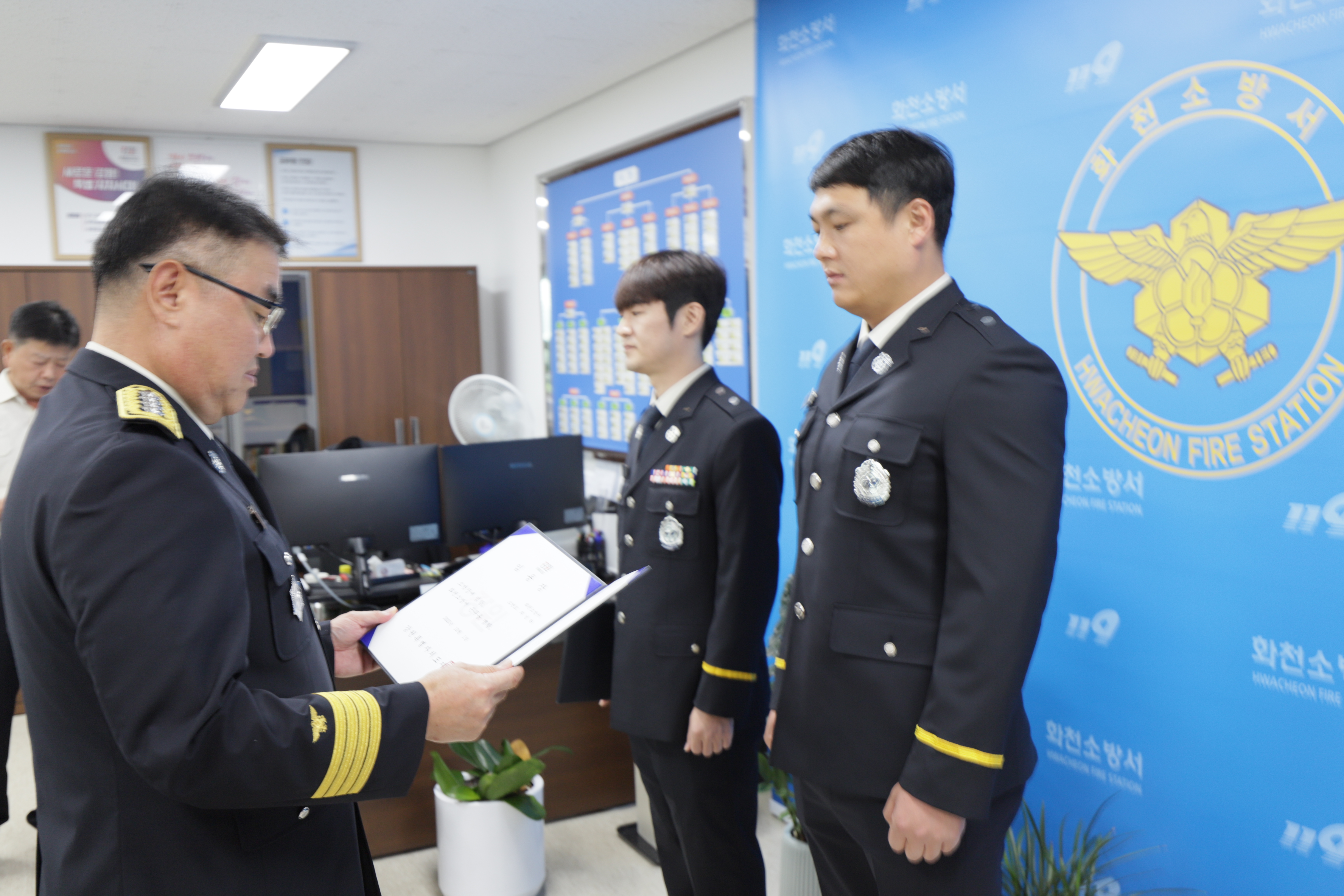 23.10.1.근속승진에 따른 근속승진자(소방장 이강현, 소방장 최성락) 신고식을 실시했다.