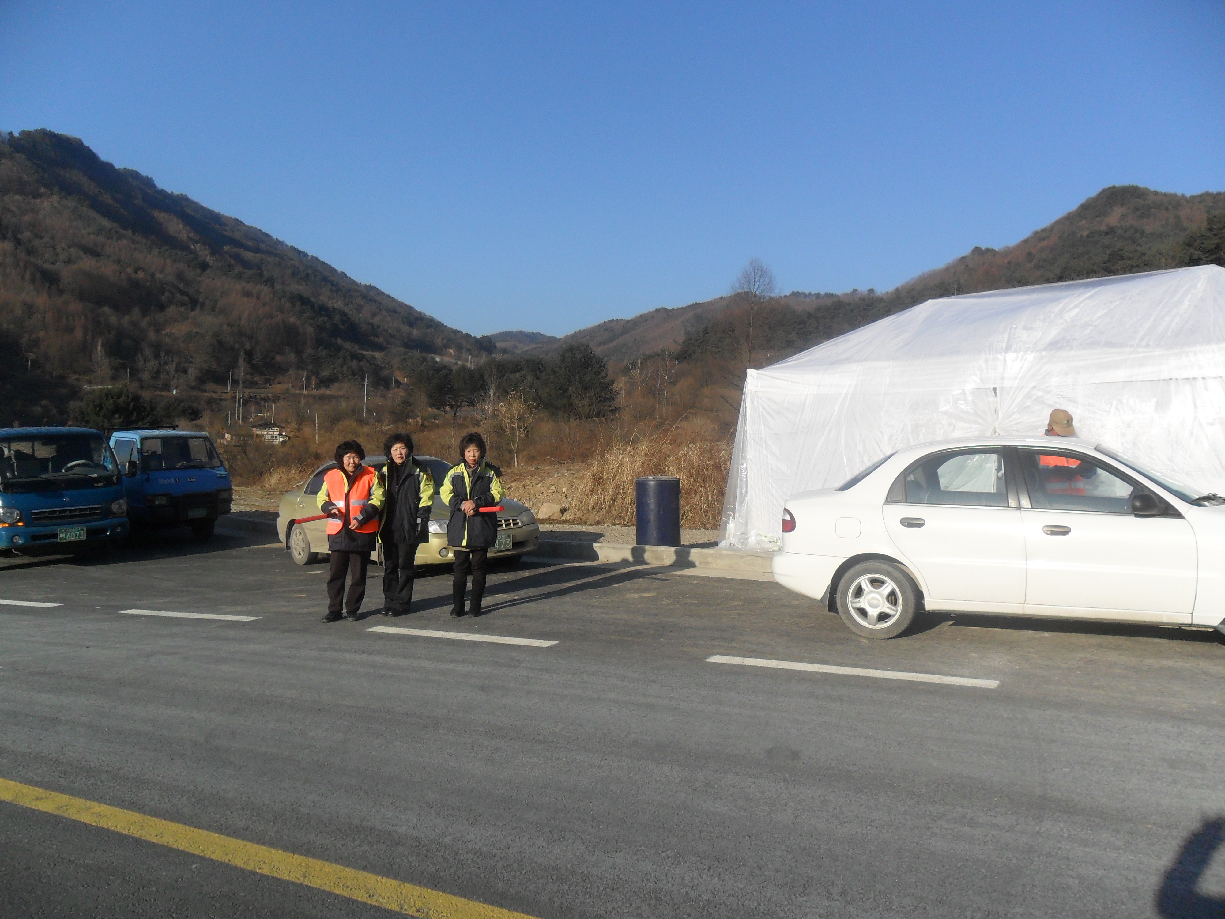 추운날씨에도 불구하고 길거리에 지켜서서 석회가루를 뿌리며 일하시는