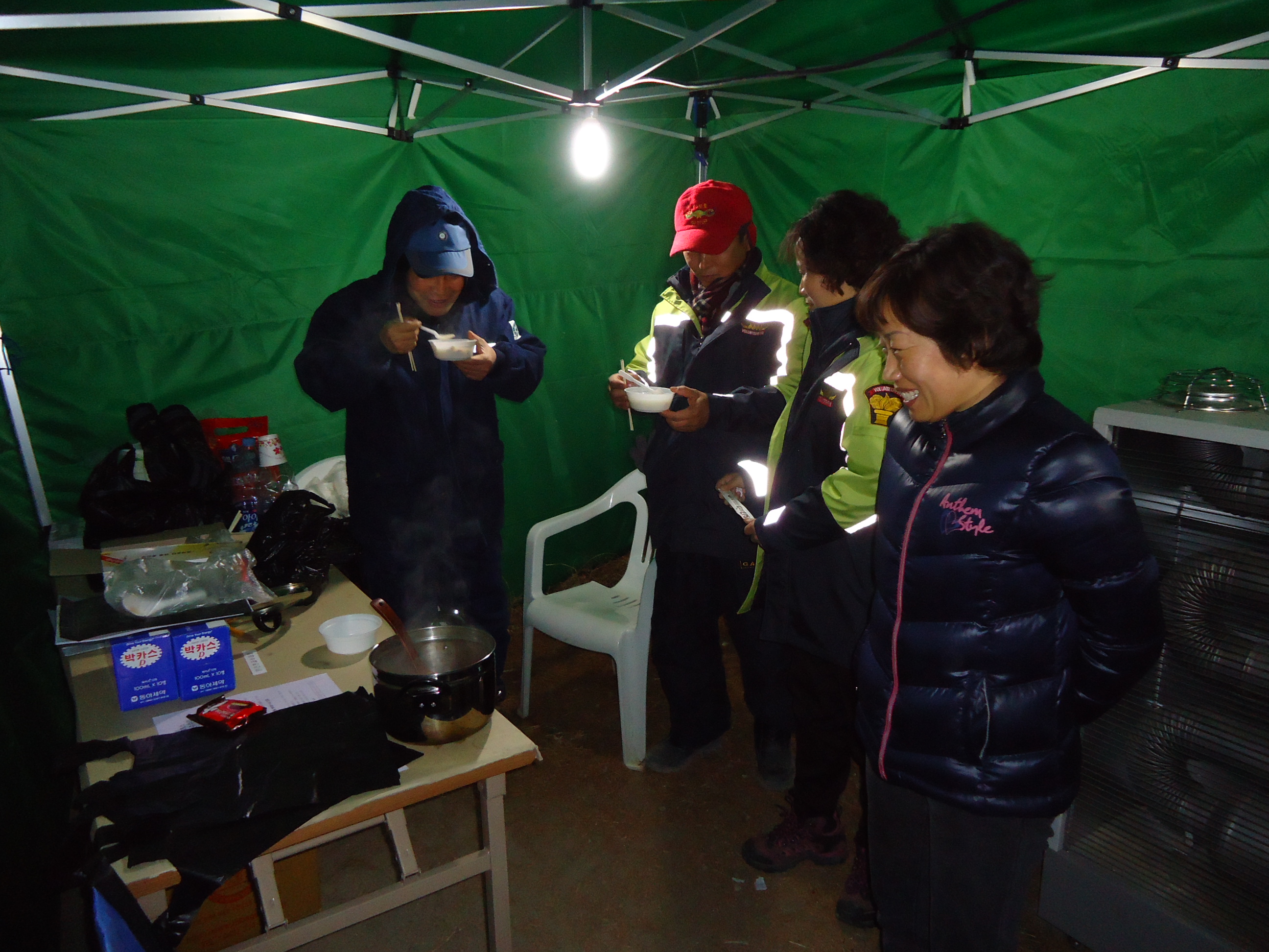 밤 10시에 구제역방제작업을 하고 있는 분들께 어묵국과 차를 대접했습니다.(둔내남성의
