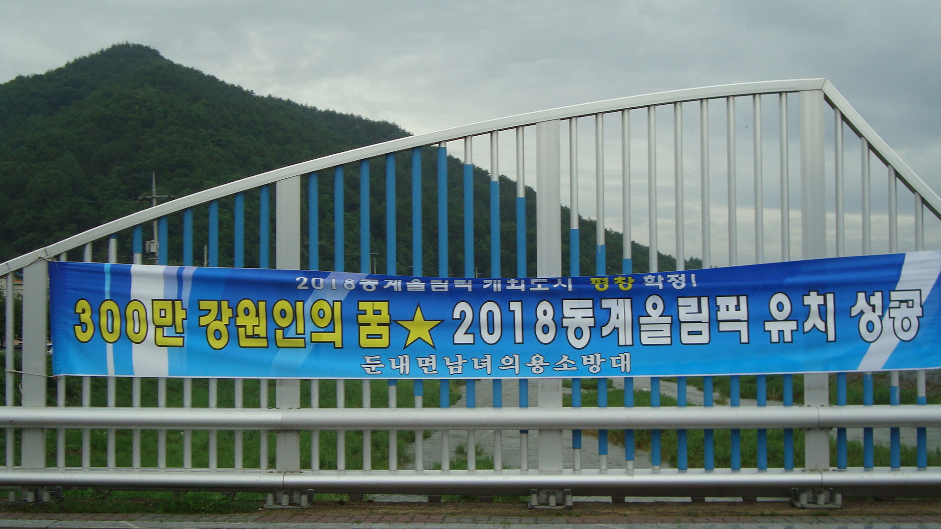 현수막을 둔내교 위에 달았습니다.