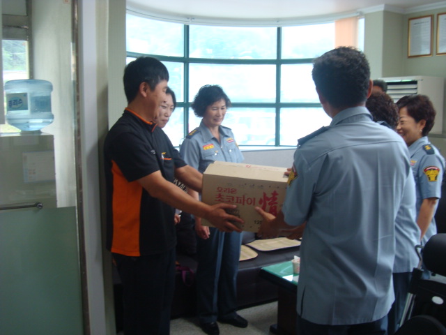 둔내 남.여 의용소방대에서 을지훈련 격려차 둔내119안전센터를 방문하여 직원들에게