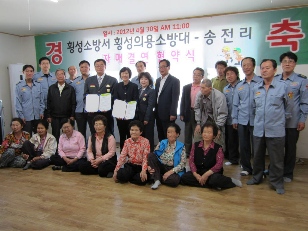 횡성의소대에서 4월 30일 오전 10시 30분부터 횡성읍 송전리 마을회와 자매결연협약을 송전리 마을회관에서 김승기 횡성읍장님을 모시고 횡성의소대 간부님들과 송전리마을 리장님을 비롯하여 어르신들을 모시고 협약식을 체결하였습니다.