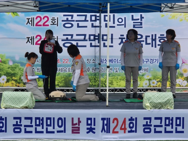횡성소방서 공근여성의용소방대는 4월 22일(화), 공근면민 체육대회 현장에서 심폐소생술(CPR) 시범을 선보이며 생명존중 문화 확산에 앞장섰습니다.