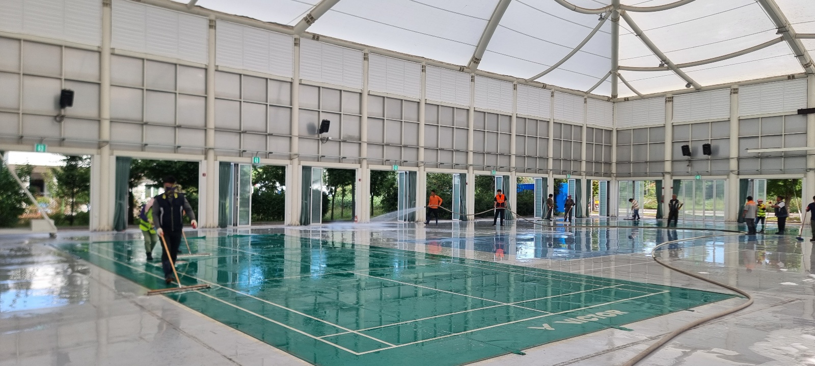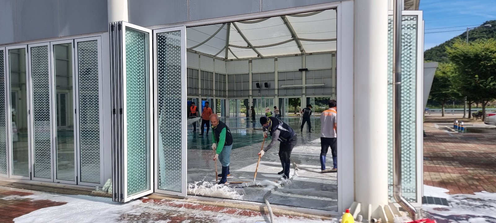 이날 대원들은 건강복지센터 및 문화체육관을 깨끗이 물청소를 실시하며 쾌적한 환경 조성에 힘썼습니다.