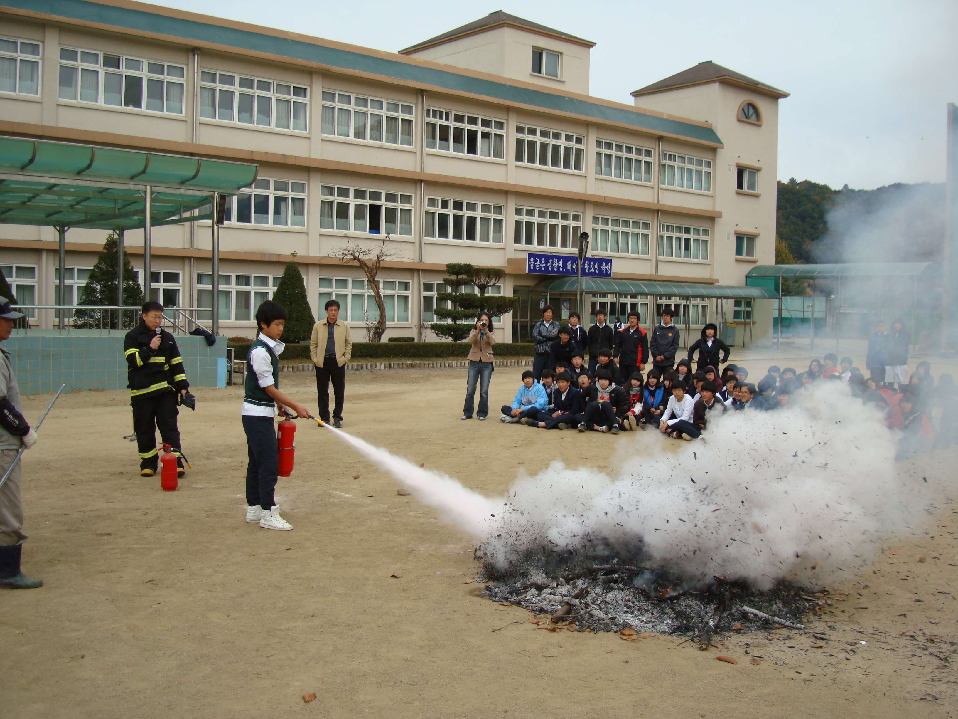 이번 훈련은 화재발생 시 대피요령, 소화기 사용법, 응급환자 발생시 대처요령 등 실시하여 화재발생 시 학생들의 즉각적인 대처요령 및 인명대피 능력 향상을 목표로 훈련에 임하였습니다.