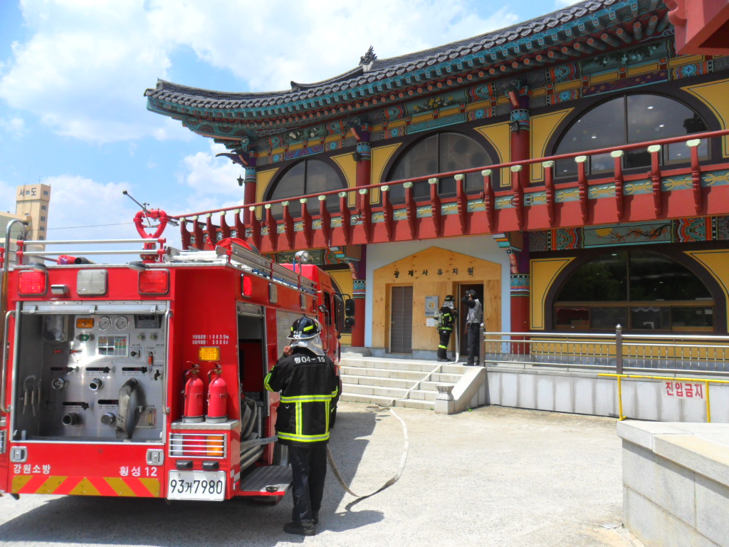 횡성소방서(서장 조근희) 횡성119안전센터에서는 2011.5.16(월) 광제사어린이집을 방문하여 아동복지시설 현지적응 소방훈련을 실시하였습니다. 소방호수 2본을 연장하여 가상화점에 신속히 진입함과 동시에 진압하는 현장훈련을 실시하였습니다. 어린이집 관계자에게 유사시 초기진화 및 대피훈련요령 교육을 실시하였고, 아울러 주기적인 소방시설점검도 당부드렸습니다.