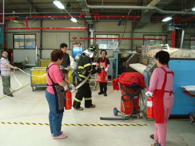 이번 훈련은 실전같은 훈련을 위해 공장내 1층에 가상화점을 부여하고, 자위소방대원 분들 및 직원 모든 분들이 참여하는 훈련으로 진행되었습니다. 화재 발생시 자위소방대원들의 각자임무숙지 및 신고요령, 초기대응 방법, 소화기 사용법등을 함께 교육하였으며, 이와 동시에 출동/철수 시 출동로 확보를 실시하였습니다