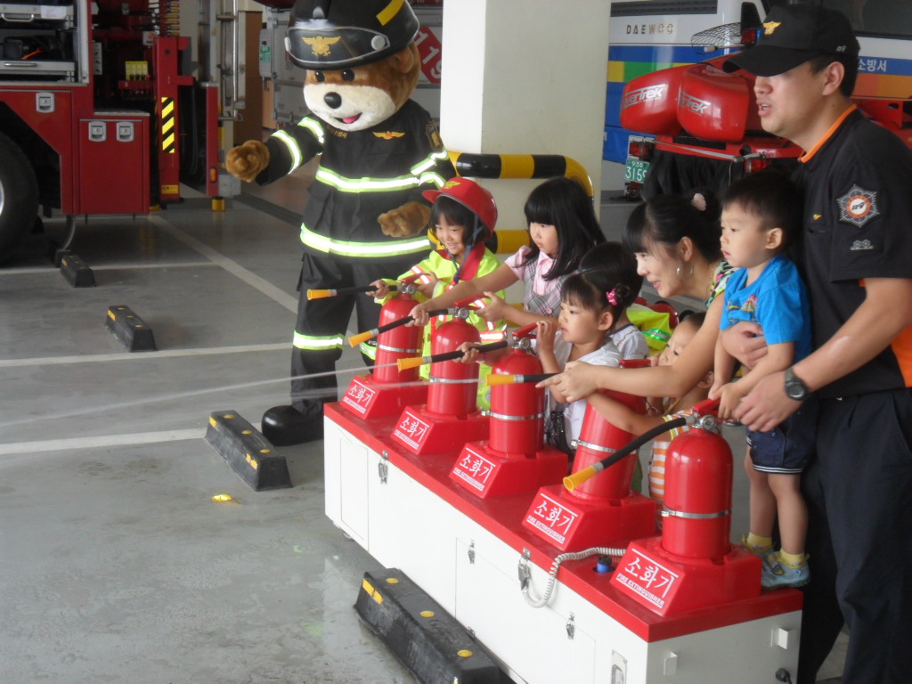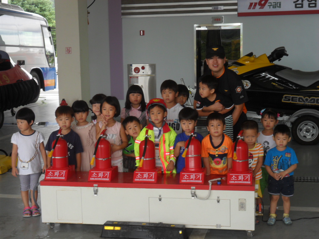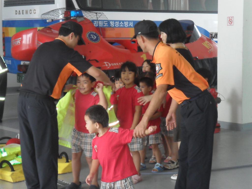 횡성소방서(서장 조근희) 횡성119안전센터에서는 2011. 08. 26(금) 11:00 횡성군 청일면에 위치한 샬롬어린이집과 강림면에 위치한 에던어린이집 원생들 60여명을 초대하여 물소화기 방수 및 구조,구급, 진압장비 체험 등을 실시하였습니다.
