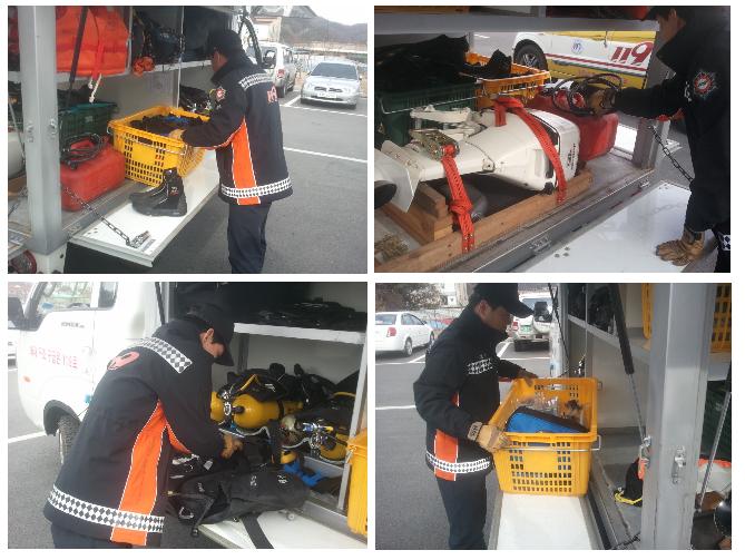 정비 내용으로는 유류 및 보트 공기주입 확인,아웃모터 작동상태 점검,트레일러 연결 볼트 및 방향지시등 상태 점검 등 각종 수난 장비에 대한 정밀점검을 실시하였다.