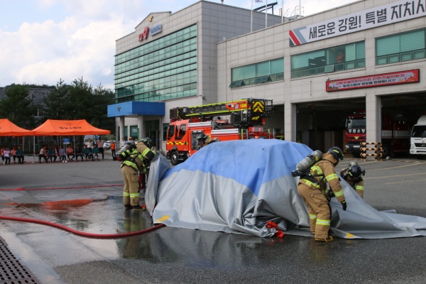 박순걸 서장의 업무보고 후에 전기차 화재진압, 소형사다리차 등 소방장비를 시연하는 시간을 가졌습니다.